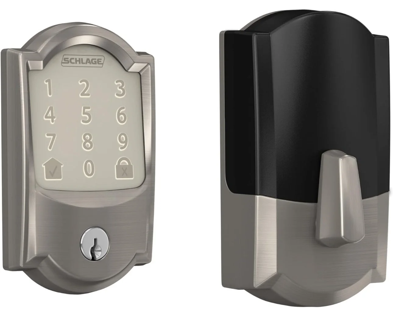 Electronic door lock with keypad and keyhole.